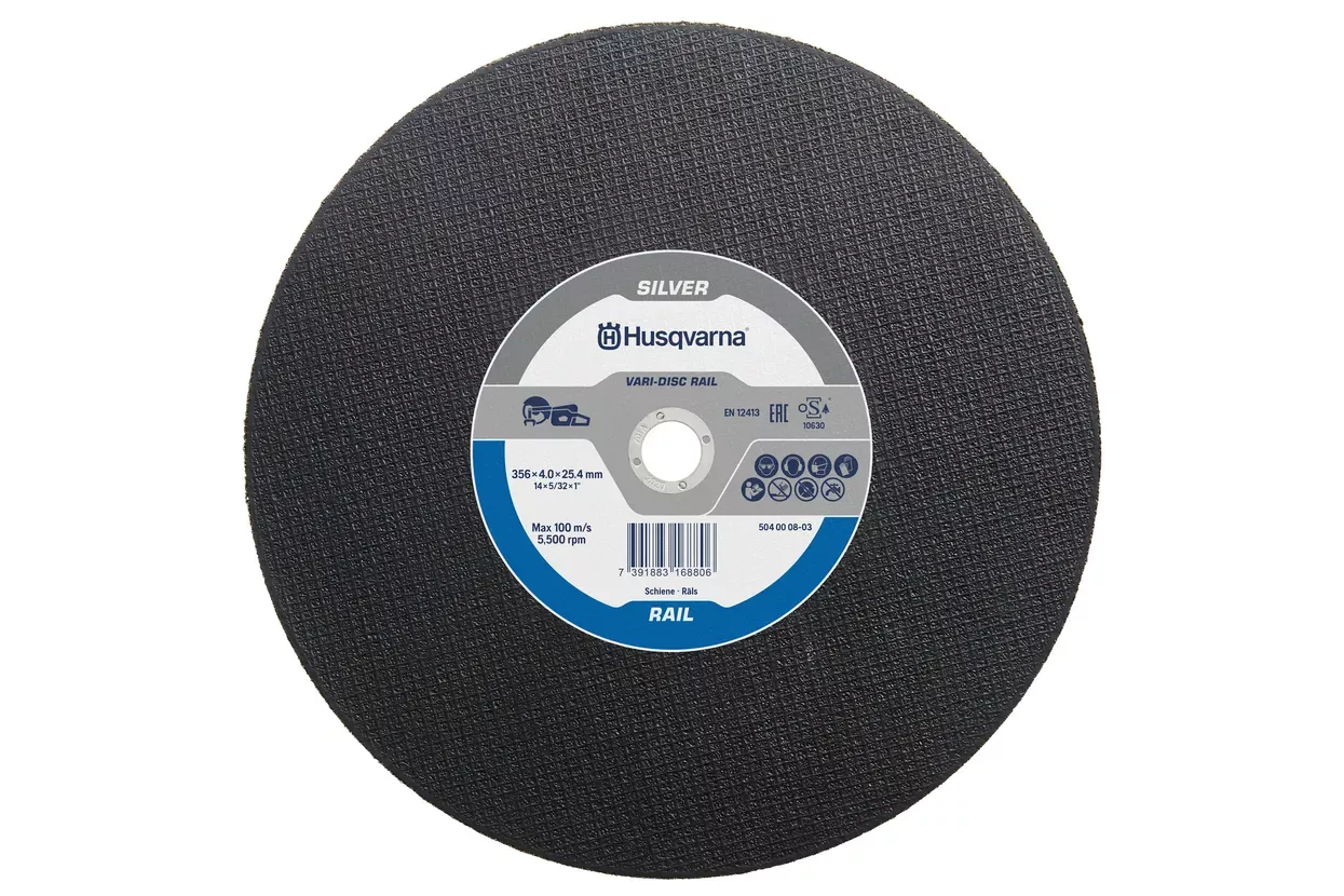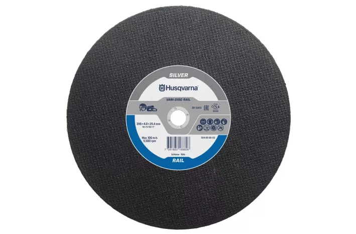 Husqvarna VARI-DISC™ RAIL - specijalizirani abrazivni disk za željezničke tračnice. Dostupan u promjerima 350 mm i 400 mm sa 4 mm širinom segmenta. Srebrna razina performansi, suho rezanje bez rashladne tekućine. Kompatibilan s rezačima snage 1,5-5,8 kW. Profesionalni alat za održavanje željezničke infrastrukture.