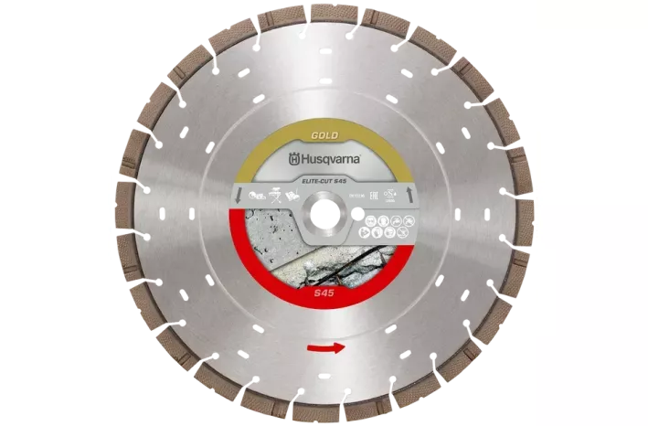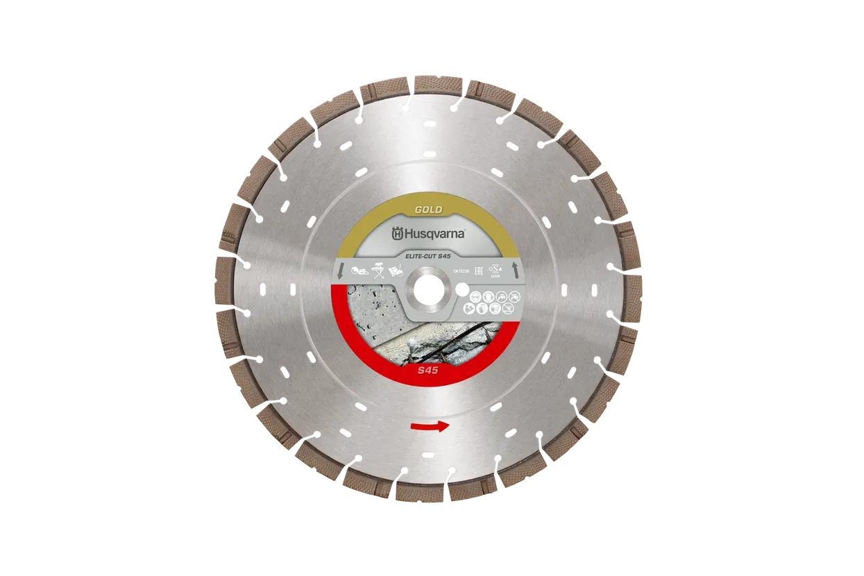 ELITE CUT S45 EXO-GRIT dijamantna rezna ploča dolazi u promjerima od 300 do 400 mm za mokro rezanje betona. Dizajnirana s naprednom Z-Edge i Flat Exo-Grit tehnologijom za smanjeno trenje, manje vibracije i učinkovito odvođenje mulja. Pruža do 20% brže rezanje i 10% duži vijek trajanja. Opremljena sigurnosnim indikatorima potrošenosti i smjera rada.