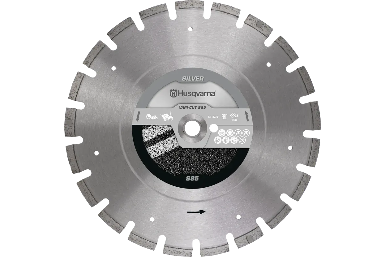 Husqvarna VARI-CUT™ S85 PLUS dijamantni rezni disk za profesionalno rezanje asfalta. Dostupan u promjerima 450mm i 500mm s osovinom 25,4mm. Segmentirana konfiguracija s mokrim hlađenjem za optimalne performanse na tvrdom asfaltu. Snaga 4-15,5kW.