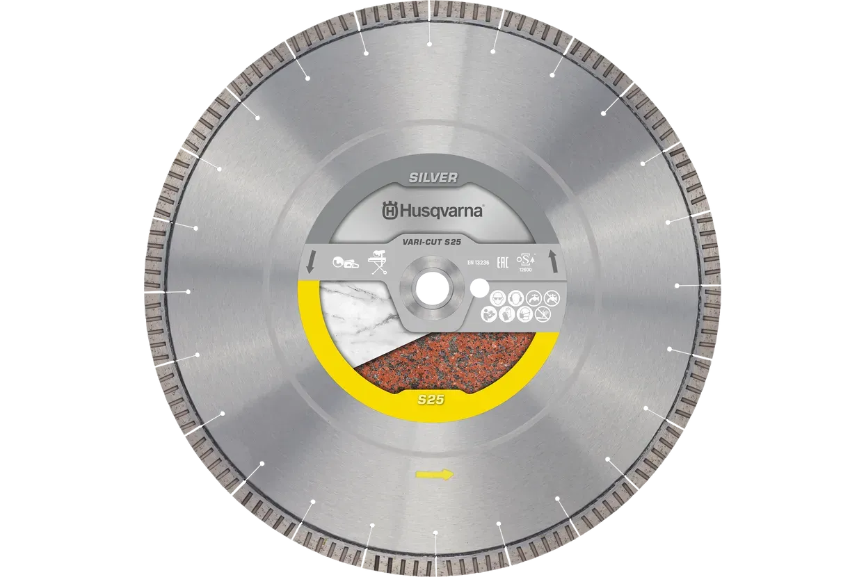 VARI CUT S25 dijamantna rezna ploča optimizirana za rezanje tvrdih prirodnih kamena. Dostupna u promjerima 300, 350 i 400 mm s provrtom od 25,4 mm. Dizajnirana za mokro rezanje s inovativnom segmentnom konstrukcijom koja osigurava preciznost i trajnost. Pogodna za profesionalnu upotrebu s visinom segmenta od 12 mm za produljeni radni vijek.