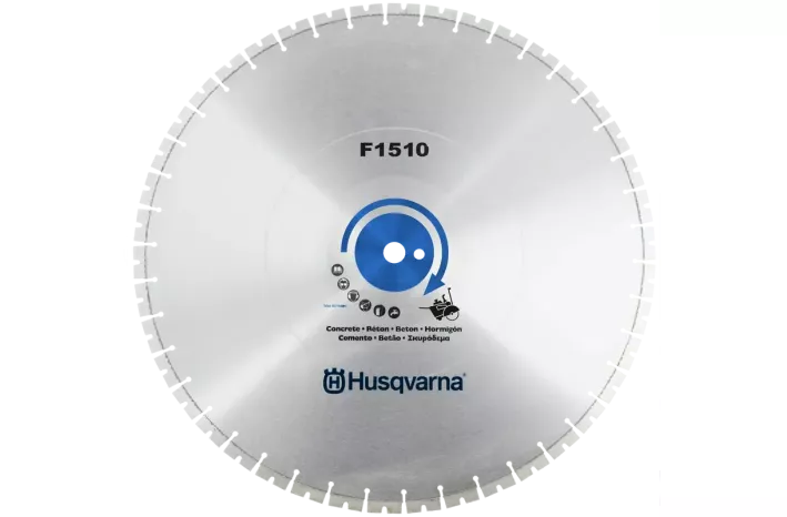 Husqvarna ELITE-CUT™ F1510 - vrhunski dijamantni diskovi za profesionalnu upotrebu na tvrdome i srednje tvrdom betonu. Dostupni u promjerima 500-1500mm s različitim širinama segmenata (3,8-5mm). Optimizirani za strojeve snage 31-50kW s mokrim rezanjem.