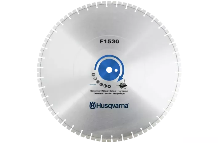 Husqvarna ELITE-CUT™ F1530 - profesionalni dijamantni disk za beton dostupan u promjerima 500-1500mm. Mokro hlađenje, segmenti širine 3,8-5mm, snaga 31-80kW. Optimiziran za srednje tvrdi beton s dugim vijekom trajanja i visokom učinkovitošću rezanja.