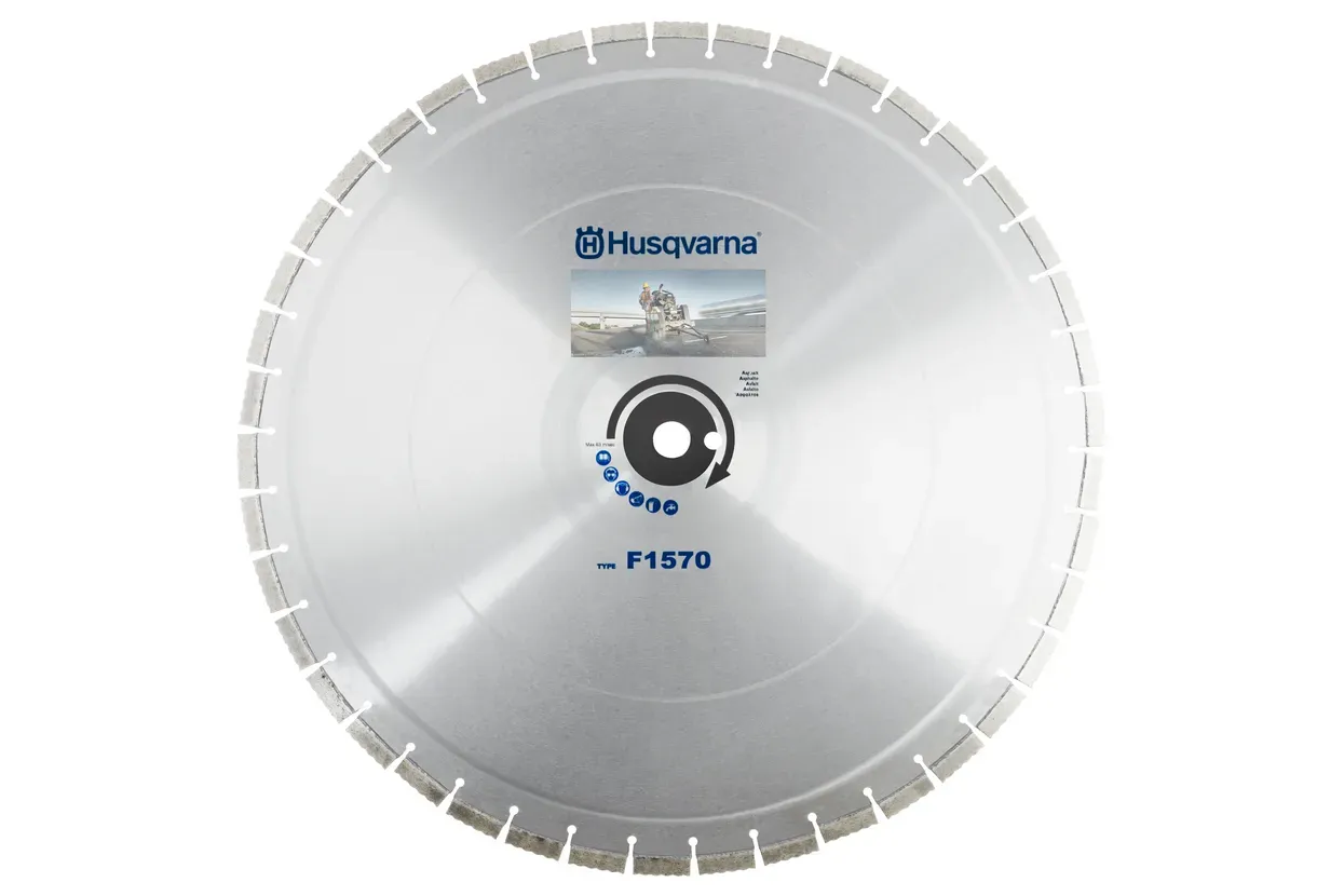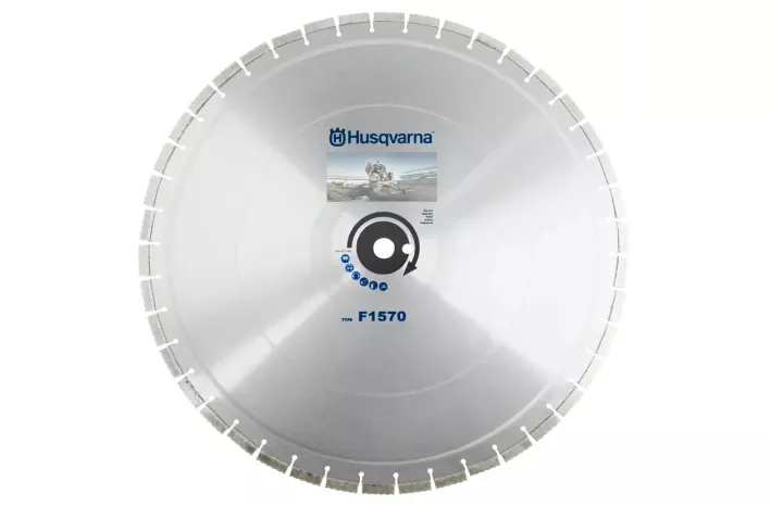 Husqvarna ELITE-CUT™ F1570 profesionalni dijamantni rezni disk za asfalt dostupan u promjerima 500-800mm. Zlatni razred kvalitete s uskim vodnim žlijebovima za strojeve 51-80kW snage.