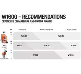 Diskovi ELITE-CUT™ W1620 dostupni su u različitim promjerima, od 600 mm do 1600 mm, što omogućava uporabu za različite projekte i aplikacije. S različitim konfiguracijama širine segmenata (od 3,8 mm do 5 mm) i različitim uzorcima rupa za stezanje (PL3012 ili PL70061) možete odabrati idealan disk za svoj specifični stroj i aplikaciju.