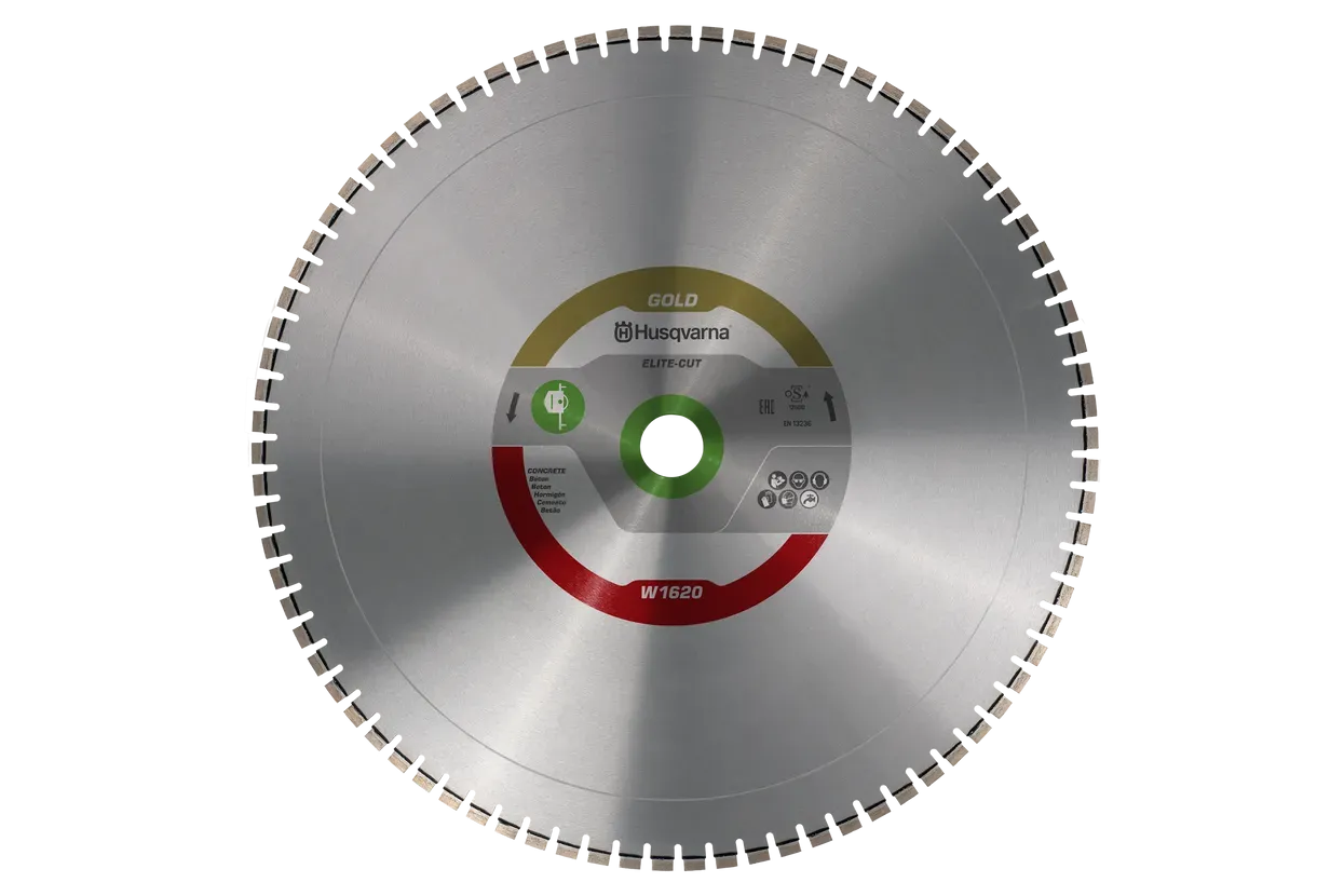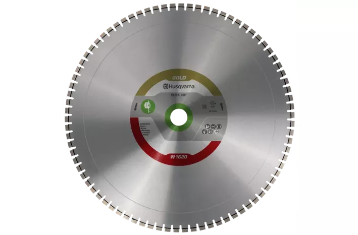 Husqvarna ELITE-CUT™ W1620 - profesionalni segmentirani dijamantni disk za rezanje betona. Zlatna serija s naprednom tehnologijom koja reže 20% brže i traje 10% duže. Dostupan u promjerima 600-1600mm s različitim širinama segmenata. Optimiziran za srednje tvrdi beton s mokrim hlađenjem.