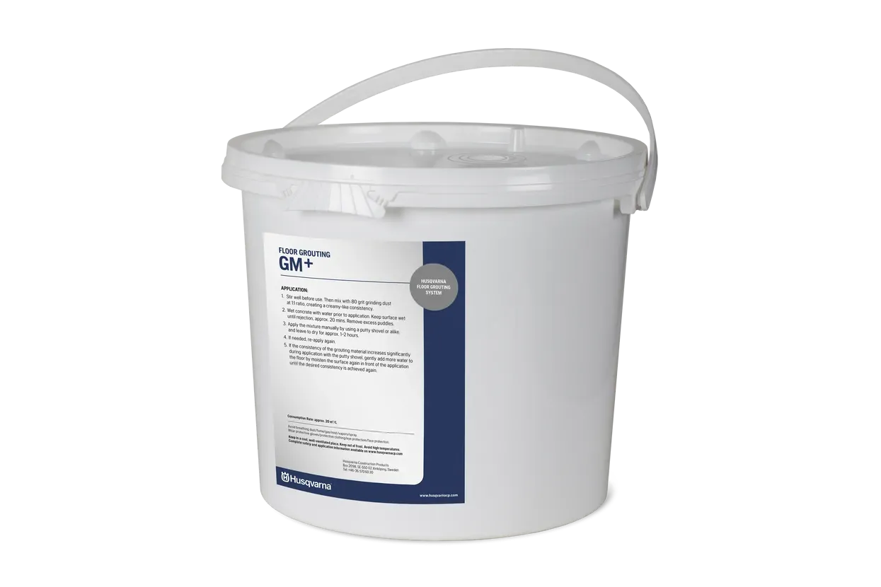Husqvarna GM+ je specijalizirani tekući preparat za učinkovito punjenje većih rupa i pukotina u betonu. Spreman za uporabu, ovaj proizvod omogućuje brzo i pouzdano saniranje betonskih površina. Idealan je za fugiranje podova, s dugim rokom trajanja od 1 godine nakon otvaranja. Jedna ambalaža od 9 L pokriva prosječno 20 m²/L površine.