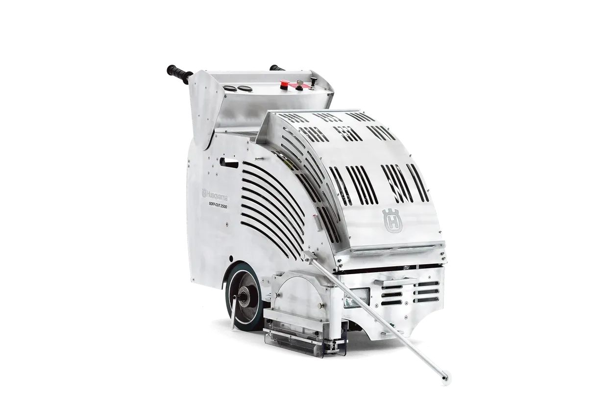 Husqvarna Soff-Cut 2500 - profesionalna samohodna pila za rano rezanje betona s Honda motorom od 11 KS (8,7 kW). Omogućava rezanje betona u ranim fazama stvrdnjavanja, sprječavajući nekontrolirane pukotine. Električna kontrola dubine, maksimalna dubina reza 38,1 mm, disk promjera 254 mm, ugrađeni priključak za prašinu.