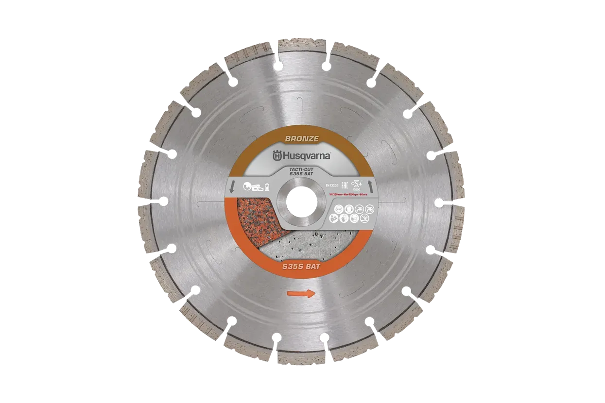 Husqvarna TACTI-CUT™ S35S BAT 250mm - profesionalna segmentirana rezna ploča promjera 250mm za precizno i učinkovito rezanje betona, opeke, blokova i granita. Optimizirana za akumulatorske i standardne električne rezače snage 0,5-2,7kW. Pogodna za mokro i suho rezanje s naprednim sigurnosnim značajkama.