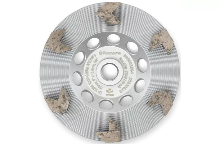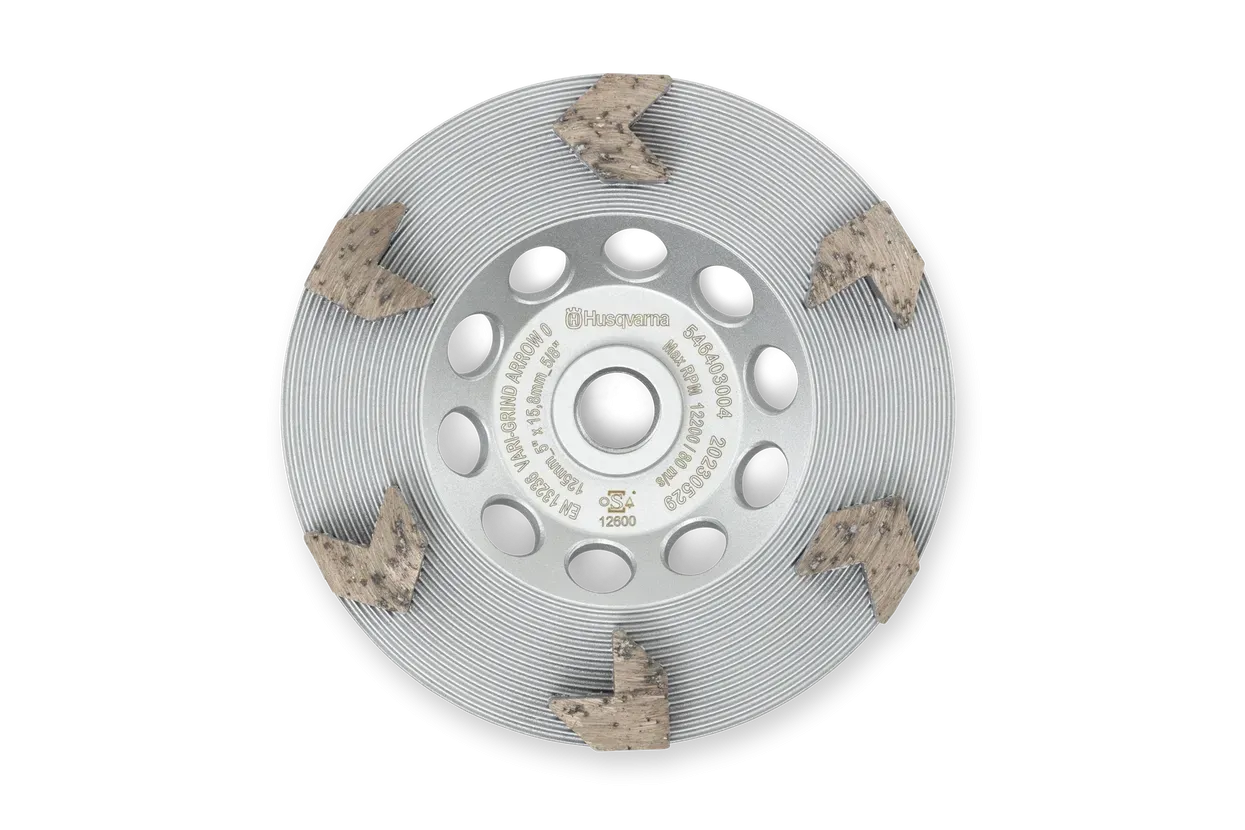 Husqvarna VARI-GRIND™ ARROW 0 - profesionalni dijamantni alat za brušenje betona i uklanjanje različitih premaza. Dostupan u veličinama 4"-7" (105-180mm) s priključcima 5/8-11 THD ili 7/8". Idealan za uklanjanje vinilnih ljepila, tankih izravnalnih masa, epoksidnih premaza i keramičkih ljepila. Suho djelovanje bez rashladne tekućine.