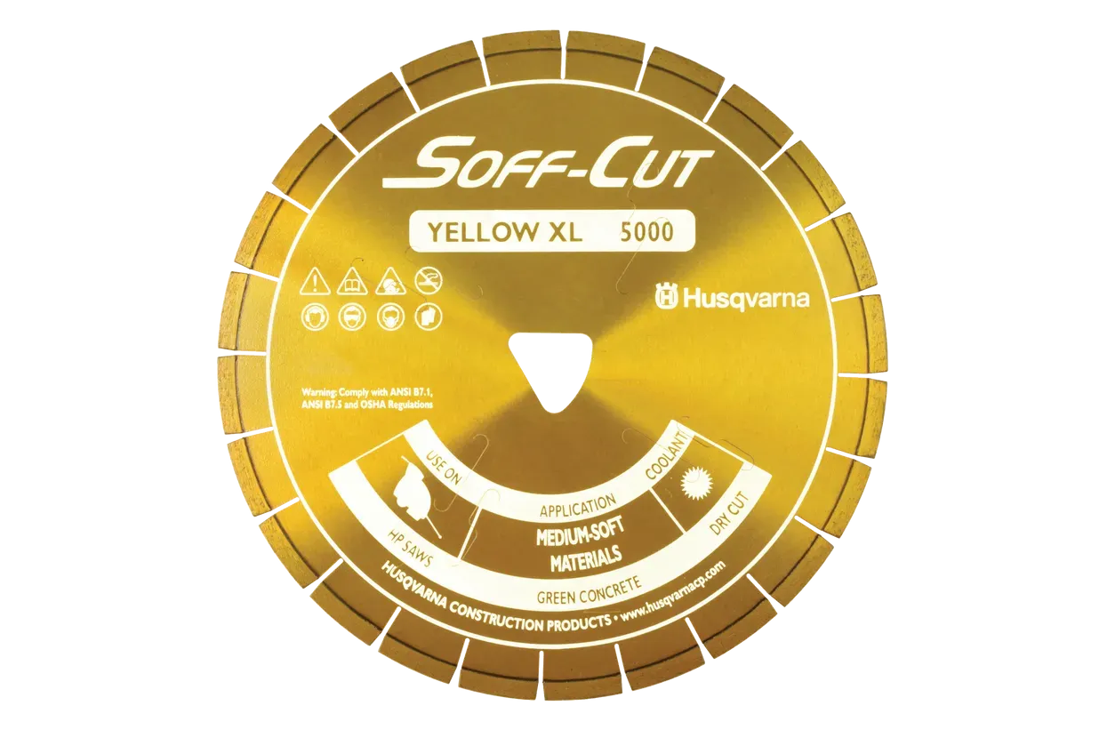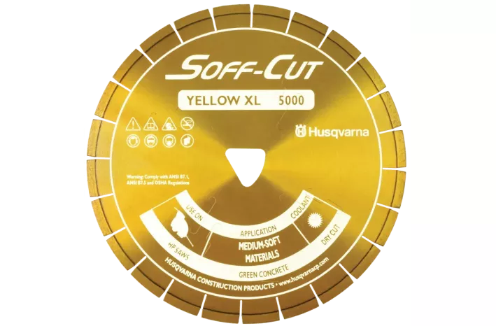 Husqvarna ELITE SOFF-CUT XL 5000 profesionalna dijamantna rezna ploča za rano rezanje zelenog betona. Dostupna u tri varijante (XL6, XL10, XL14) s promjerima 150-356mm. Zlatni standard performansi za suho rezanje, trokutasti uzorak rupe za učvršćivanje, idealna za meko do srednje abrazivni beton.