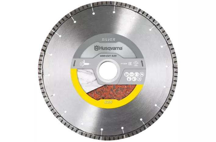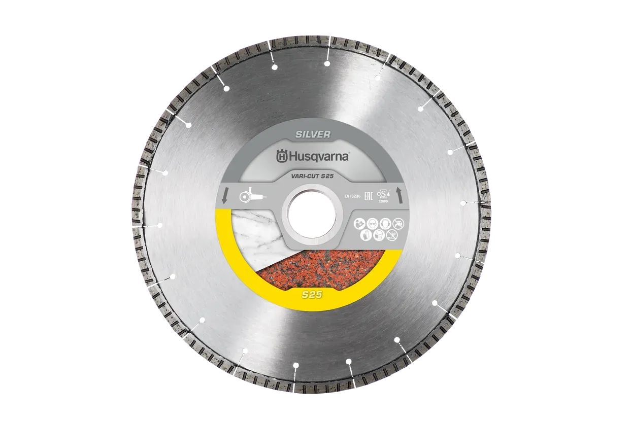 VARI CUT S25 ploča optimizirana je za kutne brusilice s provrtom kod prirubnice od 22,2 mm i promjerom osovine 22,23 mm. Njezina konstrukcija s turbo spojenim segmentima osigurava dugotrajnost i konzistentne rezultate pri radu s prirodnim kamenom.